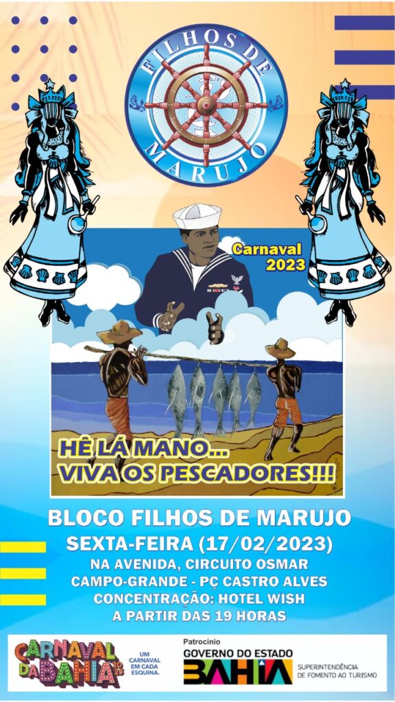 O bloco Filhos de Marujo nesta sexta-feira 17 de fevereiro de 2023 desfilará no carnaval de Salvador , no circuito Osmar Campo Grande avenida, traz a essência do Samba com seus foliões com o tema “ Hê lá Mano” , trouxe o samba de roda autêntico. por ser um bloco sócio cultural de matriz africana voltado sempre para valorização da cultura negra e afro descendente .