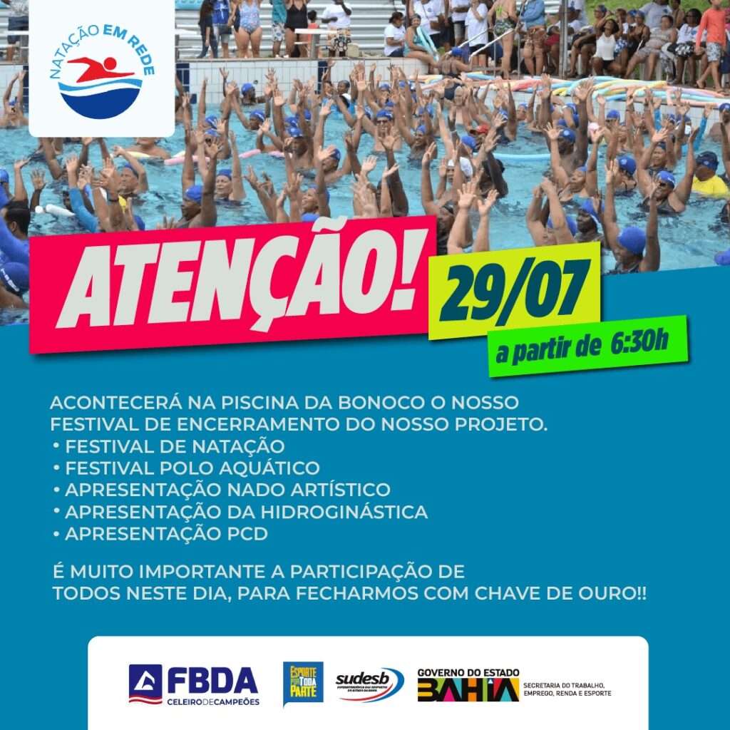 Sudesb( Superintendência dos Desportos do Estado da Bahia) e FBDA (FEDERAÇÃO BAIANA DE DESPORTOS AQUÁTICO) realizou no dia 29 de julho , na piscina Olímpica, o encerramento do projeto Natação em Rede.