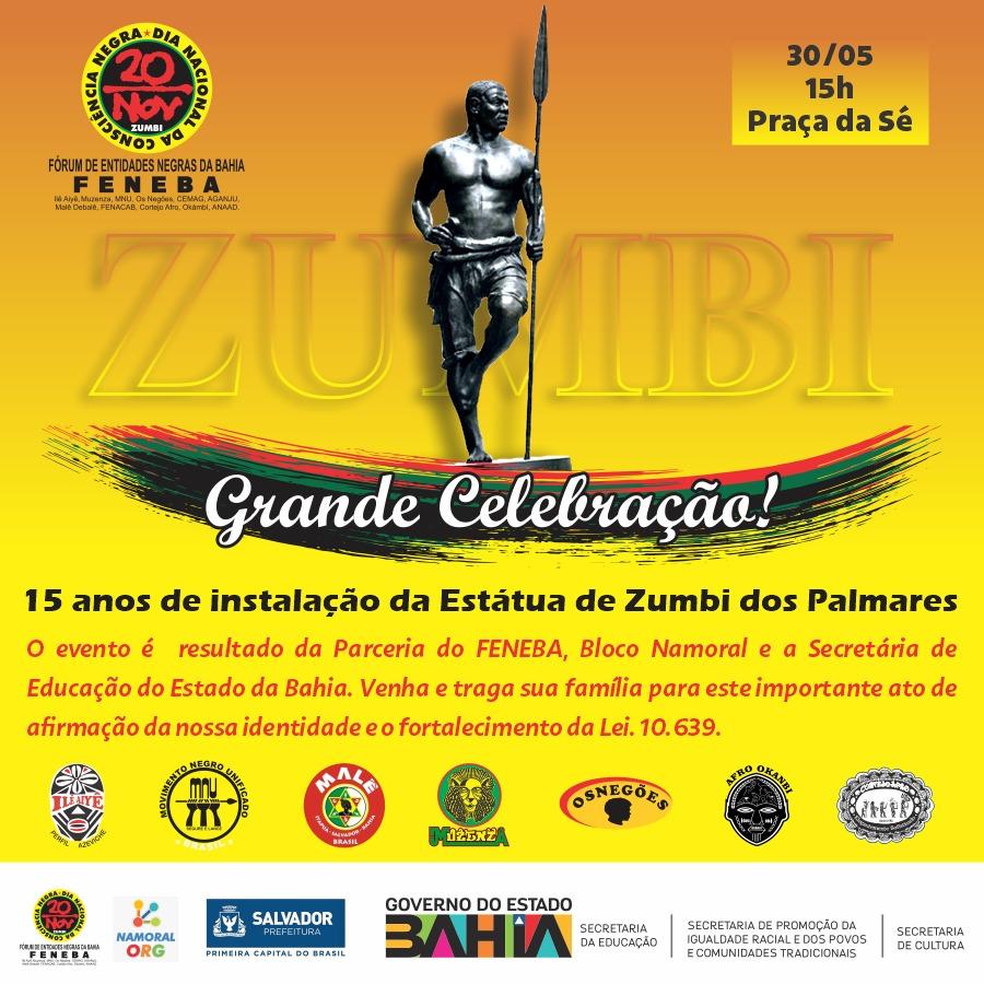 A única estátua de corpo inteiro com as características do grande guerreiro Zumbi dos Palmares , hoje 30 de maio de 2023 às 15 hs , inicia o projeto aula cantada ,que a cada mês terá um grupo cultural cantando músicas referente a causa negra no Brasil , será também relançada a cartilha Zumbi dos Palmares que será apresentado aos alunos da escola pública estadual do estado da Bahia, este evento tem a parceria com a Secretaria de Educação do Estado da Bahia , prefeitura municipal de Salvador -BA ,com a realização do Fórum de entidades negras e do grupo NamoralOrg .