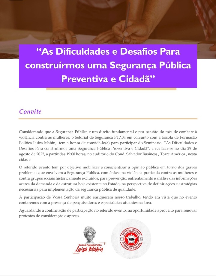 O Setorial de Segurança PT- BA, em parceria com a Escola de Formação Política Luiza Mahin convidam para o Seminário As Dificuldades e Desafios para Construírmos uma Segurança Pública preventiva e Cidadã