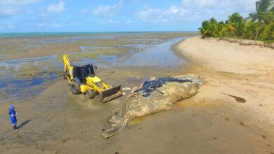 Baleia jubarte de 13 m é encontrada na praia do Guaiú
